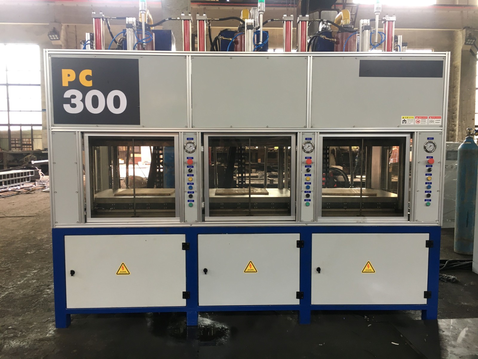 1.主机型式: 四柱式,三缸,三组热板,自上往下型式,控制柜在机器右侧。